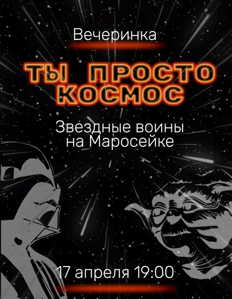 Да пребудет с вами пятница! 17 апреля Центральный рынок на Маросейке превратится в далекую галактику. Приглашаем вас на вечеринку «Ты просто космос». Погрузимся во вселенную «Звёздных воин» прямо в центре Москвы. Что в программе: Welcome: игристое и фирменные напитки с 19:00. Иммерсивное шоу: встреча с Йодой и Дартом Вейдером, предсказания от Вселенной и космические […]